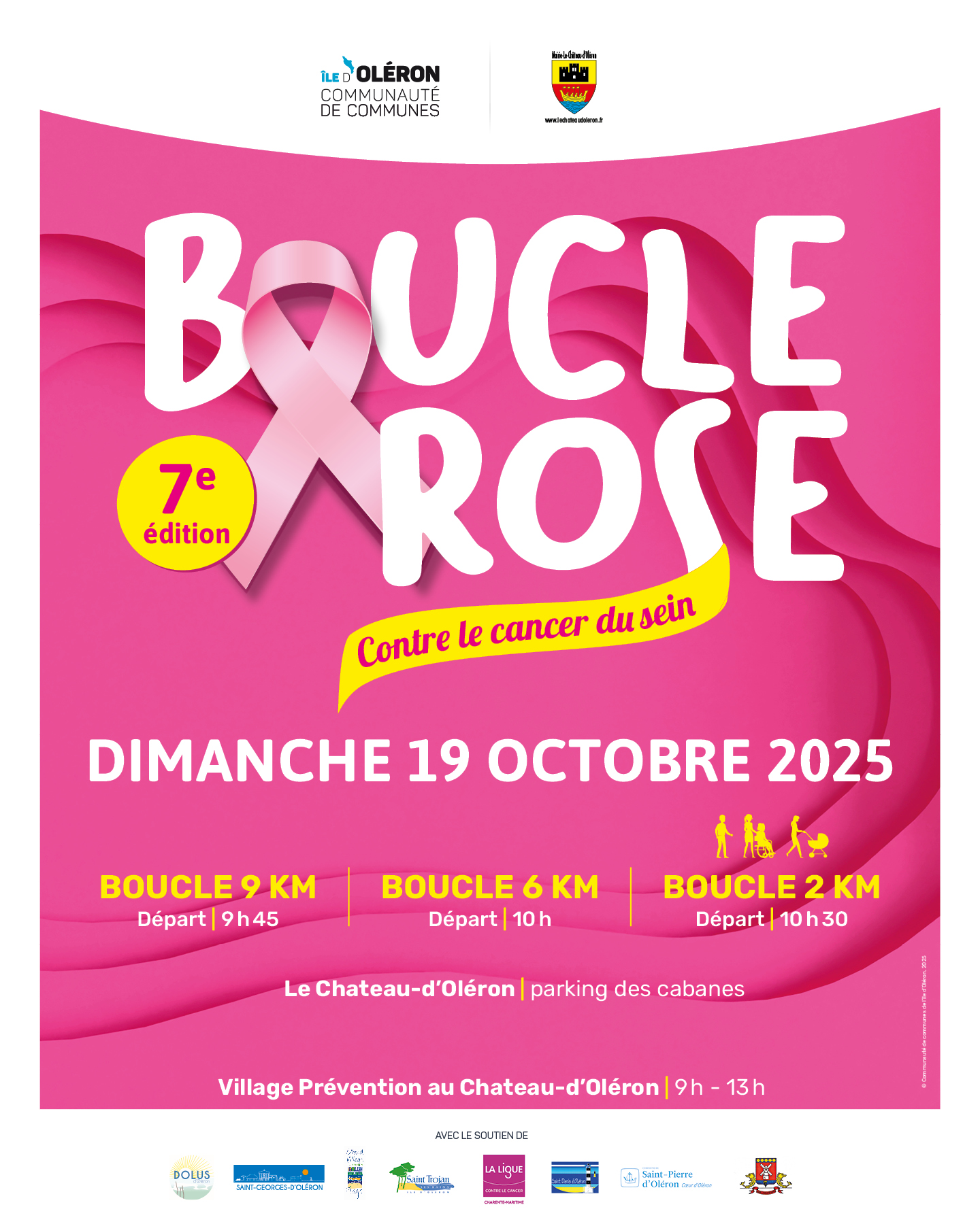 7e édition de la boucle rose sur Oléron contre le cancer du sein. 3 boucles de marche sont proposées et un village de prévention. Une boucle de 9 km qui partira à 9h45 ;Une boucle de 6 km qui partira à 10h ;Une boucle de 2 km avec départ à 10h30 destinée également aux familles avec des poussettes, aux PMR. De 12h à 13h : Concert Ukulélé Le village de prévention sera installé de 9h à 13h - parvis des cabanes au Château d'Oléron