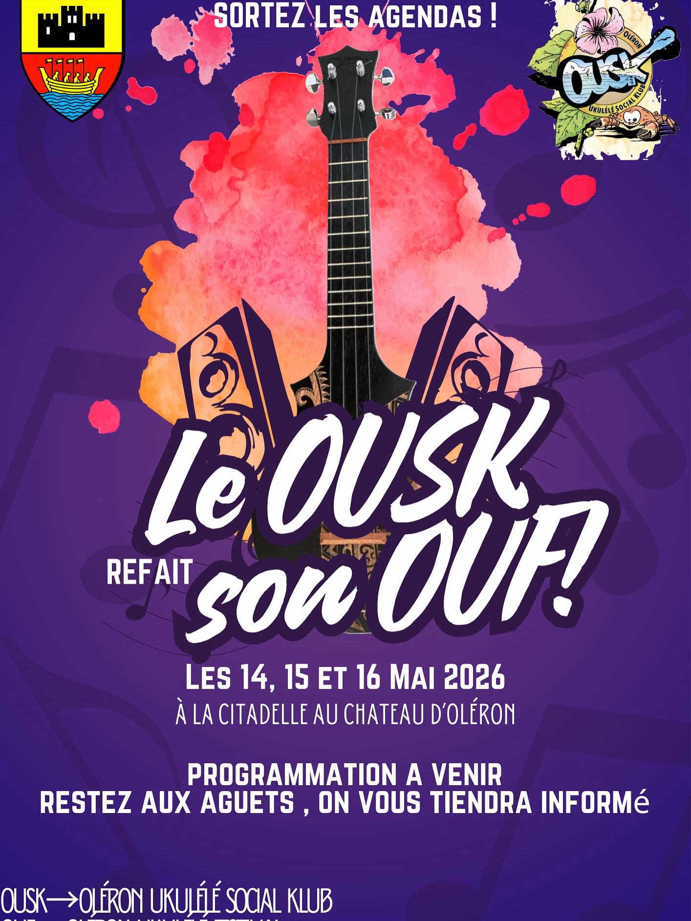 14 au 17 MAI 2026 – 5ème édition du Oléron Ukulélé FestivalPour cette cinquième édition, le festival se déroule dans le site exceptionnel du la Citadelle du Château d’Oléron où l’aventure du Oléron Ukulélé Social Klub a commencé il y a 17 ans dans la ville où est né le Motu. Trois concerts en soirée les 14, 15, 16 mai et le bâtiment de l’Arsenal accueillera des exposants, un musée itinérant du ukulélé et des master-classes. Selon la météo la scène ouverte se déroulera sur une scène extérieure ou dans le bâtiment de l’Arsenal les 14/15/16 mai de 14h00 à